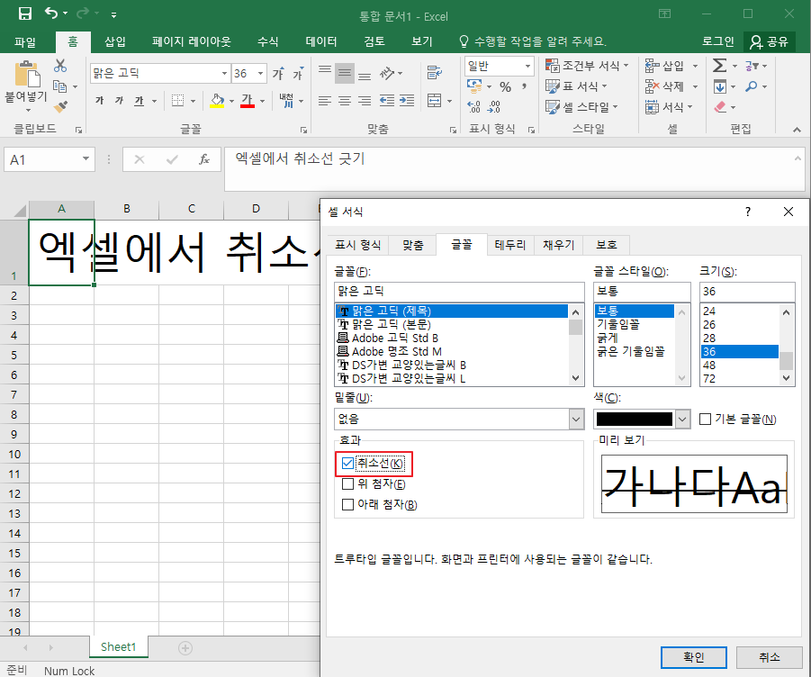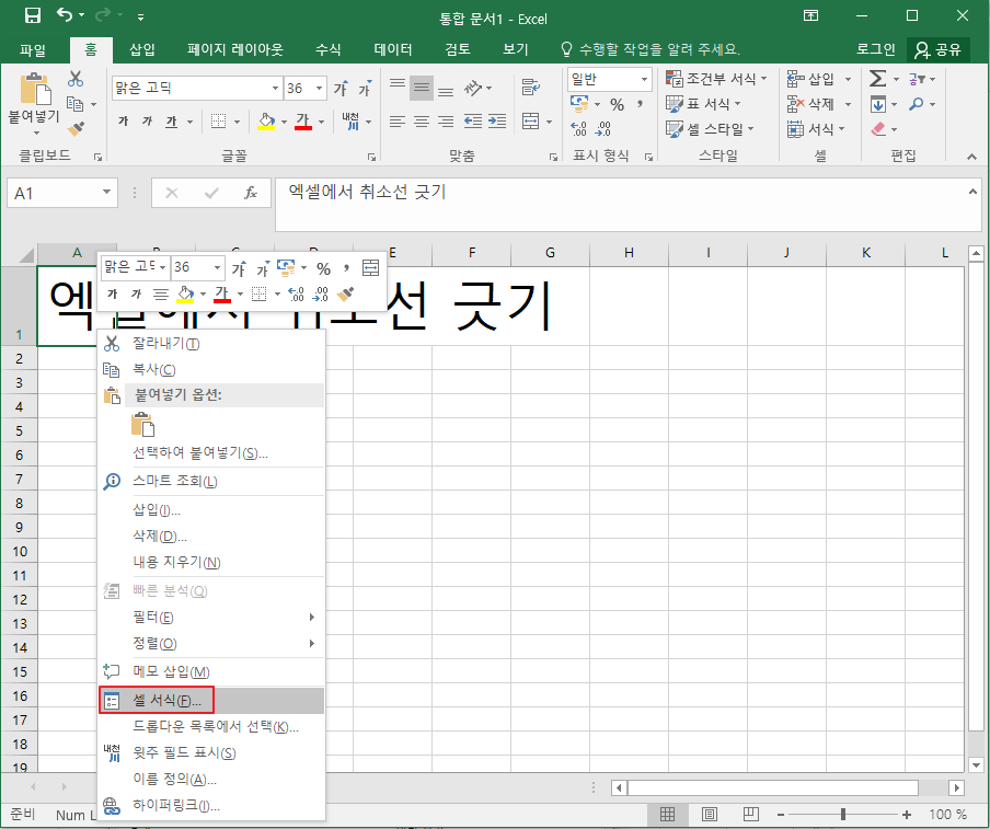 엑셀 작업을 하다보면 글자에 취소선을 그어야 할 때가 있습니다.