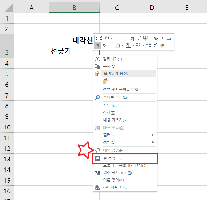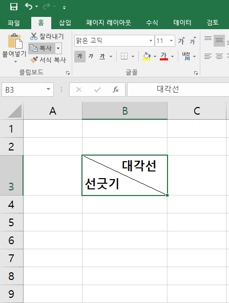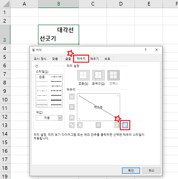셀 대각선 선긋기 방법