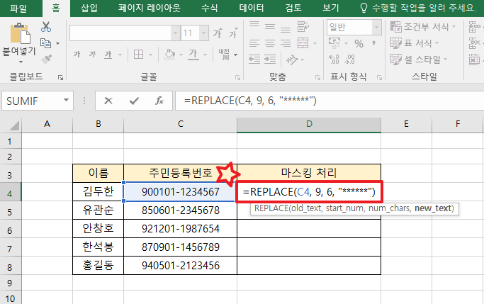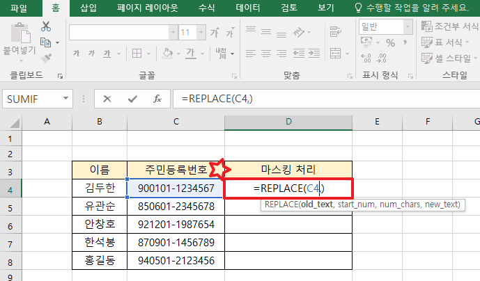 엑셀 주민등록번호 뒷자리 마스킹 처리 방법