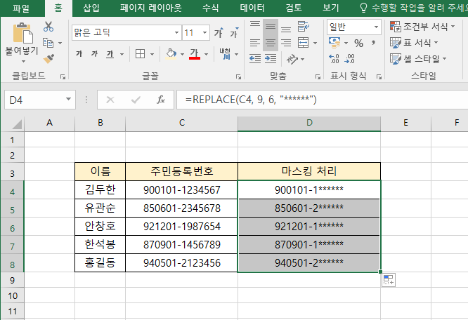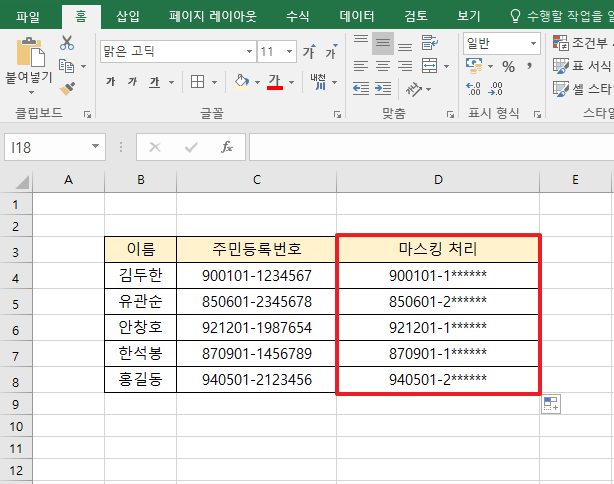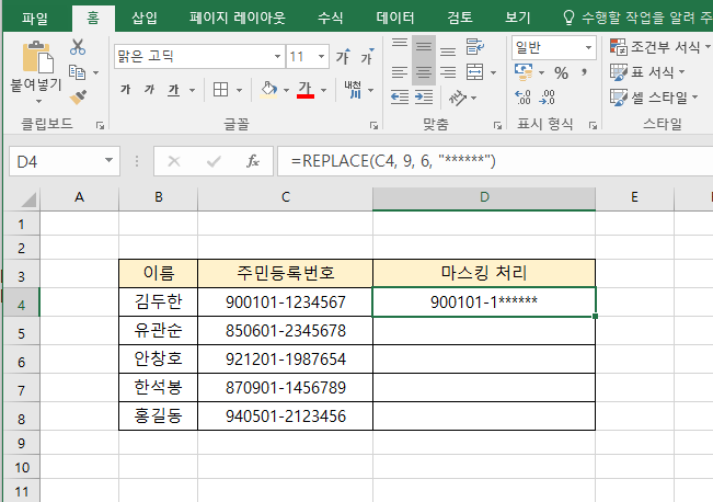 엑셀에서 주민등록번호 뒷자리를 특수문자(*)로 마스킹 처리하여 관리할 수 있습니다.