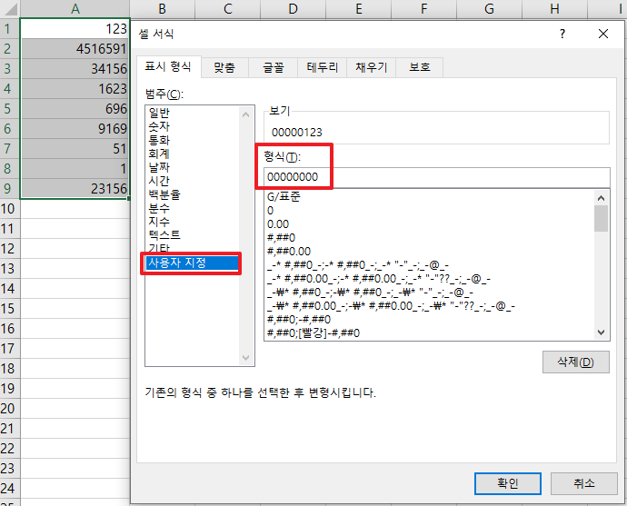 나. 사용자 지정에서 자릿수에 맞춰 형식에 0 입력